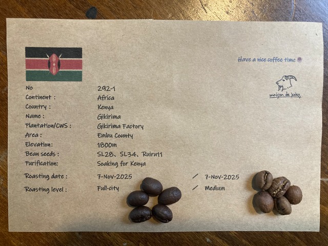 Country :Kenya Plantation : Gikirima Factory Area : Embu County Elevation:1800m Bean seeds : SL28,SL34,Ruiru11 *Peaberry Producer : Kibugu producer association Purification : Soaking Kenya 【 Story 】 Mt.Kenya 南東部の高地。 エンブ人とムベーレ人が暮らし、コーヒーと茶畑、Wilaya ya Mto Tana(スワヒリ語: タナ川) が流れる、Wilaya ya Embu(スワヒリ語: エンブ県) 。 ムウェア国立保護区のキリン達を遠くに想像しながら・・・ ・・・ どうぞ☕️ 【 商品詳細 】 - 45g - 焙煎度合を選択してください - 豆でご準備します - 価格に8%の消費税を含んでいます 【 発送日と配送方法 】 - 発送日:ご注文いただいた日の翌日以降4日後以内 - 発送方法:クリックポスト 【 お受取 】 - 郵便受けに投函 【 送料 】 - 送料はお客様負担です - 1梱包の送料です。 Free choice(商品名に★星印のある商品)は5点まで同包可能です - 送料に消費税10%を含んでいます 【 備考欄にご記入ください! 】 - 粉のご希望の方はリクエストしてください (当店での挽き目でご用意します) 【 その他 】 - オンラインショップでお買い上げの商品は、実店舗でお引渡しは出来ません - 決済後のキャンセルはお受けできません 今朝はどれを飲もうかな〜 なんて、朝の愉しみが増えれることで 良い1日が始まるのかも そんな日々のちょっとしたこと コーヒーを通じてお手伝い出来れば嬉しく思います coco